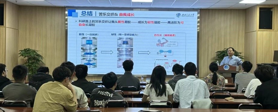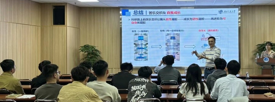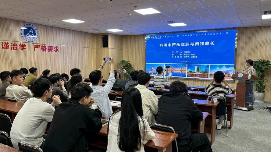 首先是“研究生分享”环节。张雪莲以“科研中苦乐交织与自我成长”为题展开分享。她讲述了在科研道路上遭遇挫折、面临质疑时的内心挣扎与应对历程,生动呈现了个人在困境中如何调整心态、汲取经验实现成长。