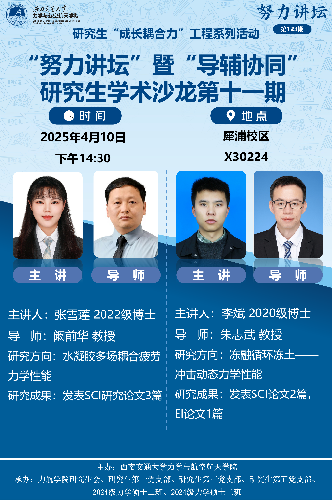 2025年4月10日下午,beat365正版唯一官网必一“努力讲坛”暨“导辅协同”研究生学术沙龙第十一期在犀浦校区X30224举行。学院副院长阚前华、党委副书记孔祥彬、辅导员安晟斐及众多研究生参与本次沙龙。主讲人为学院研究生第三党支部成员、2020级博士生李斌和研究生第一党支部成员、2022级博士生张雪莲。沙龙由学院研究生第三党支部书记胡持主持。