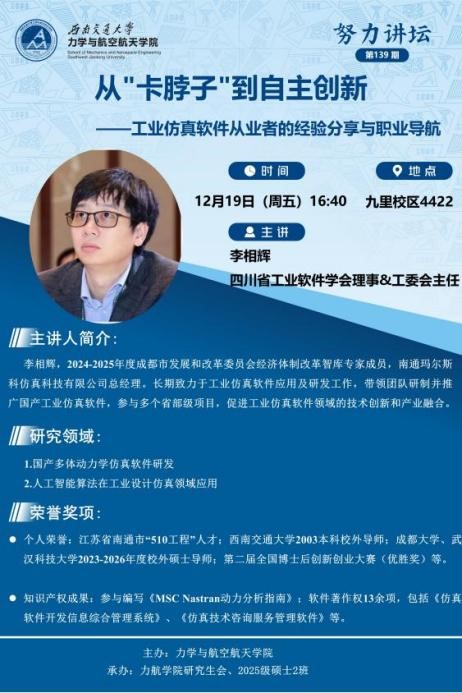 2025年12月19日,我院2002级校友、四川省工业软件学会理事、工委会主任李相辉受邀以“从‘卡脖子’到自主创新——工业仿真软件从业者的经验分享与职业导航”为题,在J4422开展努力讲坛第139期讲座。学院党委副书记孔祥彬、2025级研究生参与讲座。讲座由2025级硕士2班班长李秀婷主持。