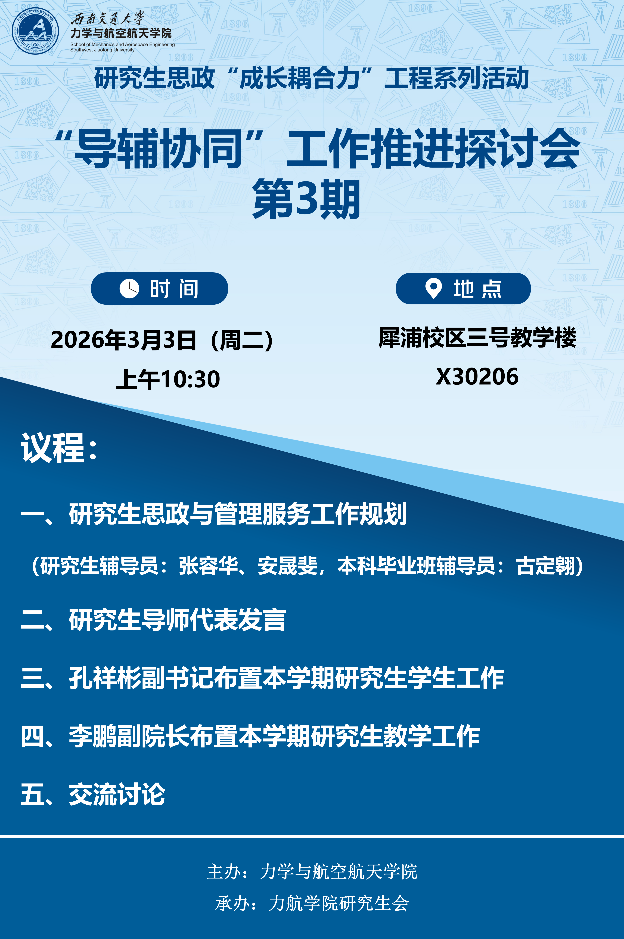 为增强导辅协同工作体系建设,促进导师和辅导员间的高效沟通,凝聚育人合力,2026年3月3日上午,beat365正版唯一官网必一研究生思政“成长耦合力”工程系列活动之“导辅协同”工作推进探讨会第三期在犀浦校区X30206举行。学院党委副书记孔祥彬,副院长李鹏,导师代表王宇星,研究生辅导员张容华、安晟斐,本科毕业班辅导员古定翱参加会议。