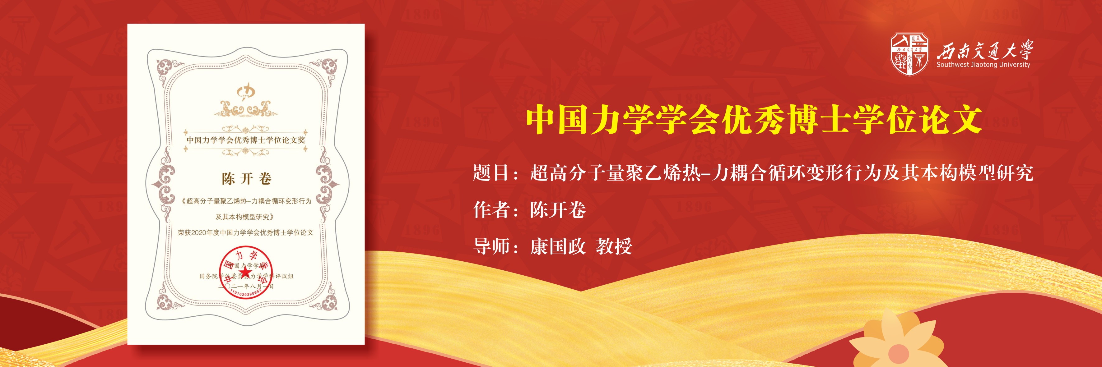 学校新闻网站链接:https://news.swjtu.edu.cn/shownews-22836.shtml为推动中国力学学科领域的科技进步,促进高层次创造性青年人才的培养工作,中国力学学会和国务院学位委员会力学学科评议组共同设立了“中国力学优秀博士学位论文”奖励。评选工作每年进行一次,遵循“科学公正、注重创新、严格筛选、宁缺毋滥”的原则进行。本次中国力学学会优秀博士学位论文评选是中国力学学会和国务院学位委员会力学学科评议组共同设立“...