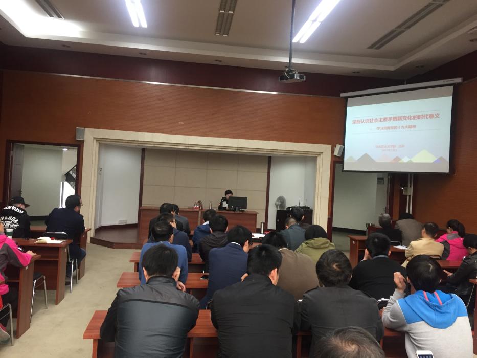 认真学习宣传贯彻党的十九大精神,是力学学院当前和今后一个时期的首要政治任务。为了更好地推动学院全体教职工学深悟透践行党的十九大精神,2017年11月9日下午14:30,力学学院主动联系邀请“beat365正版唯一官网必一学习贯彻党的十九大精神宣讲团”成员汪澎老师宣讲十九大精神。本次宣讲的地点是九里校区1号综合楼240学术厅,宣讲的主题是《深刻认识社会主要矛盾新变化的时代意义—学习贯彻党的十九大精神》,力学学院全体教职工认真聆听了此次讲座。本次宣讲由学院党委金建明书记主持。