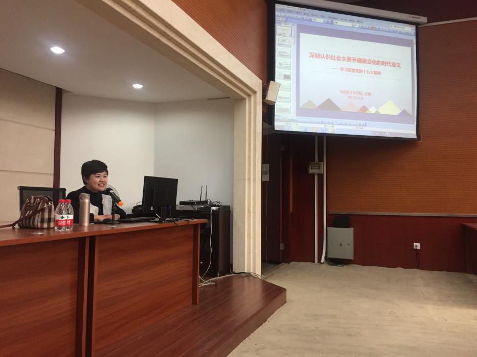 汪澎老师的宣讲主要聚焦于十九大报告中提出的“中国特色社会主义进入新时代,我国社会主要矛盾已经转化为人民日益增长的美好生活需要和不平衡不充分的发展之间的矛盾”,从四个方面分析了我国社会主要矛盾这一关系全局的历史性变化:社会主要矛盾的新变化、社会主要矛盾缘何而改变——新时代、社会主要矛盾新变化带来新要求、社会主要矛盾新变化的时代意义。同时汪澎老师指出:人民日益增长的美好生活需要和不平衡不充分的发展之间的矛盾同人民日益增长的物质文化需要同落后的社会生产之间的矛盾,并不是对立关系,两个判断既相互区别,又相互联系。我国社会主要矛盾的变化并没有改变我国社会主义所处历史阶段的判断,我国仍处于并将长期处于社会主义初级阶段的基本国情没有变。