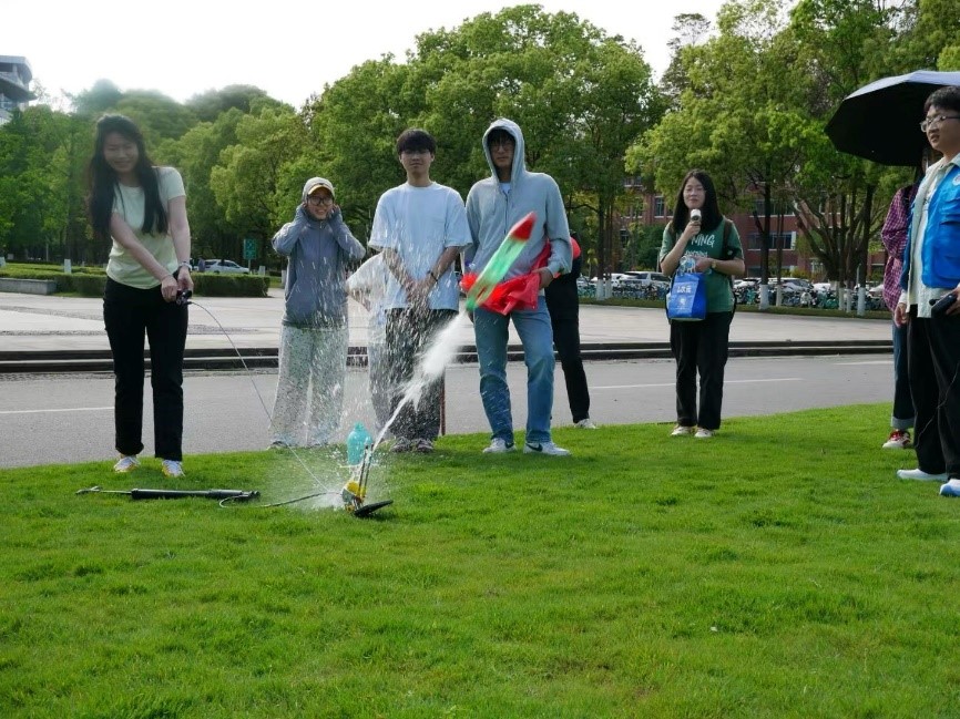 接下来,同学们移步交大校园,在开阔的校园草坪上体验水火箭项目,并参观交大南门、竢实扬华墙、张维雕像、力航学院飞机展示园、校史馆、图书馆等,在此期间,学院文化大使团成员为大家讲解每一处建筑的来源与意义。