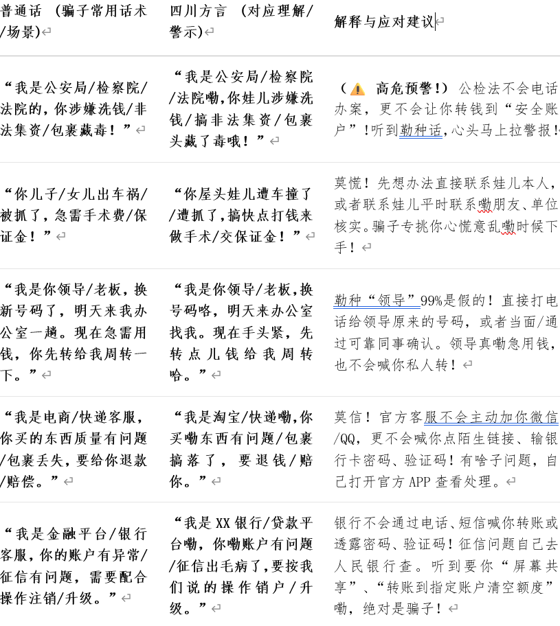 图2. 《防诈骗方言-普通话对照表》