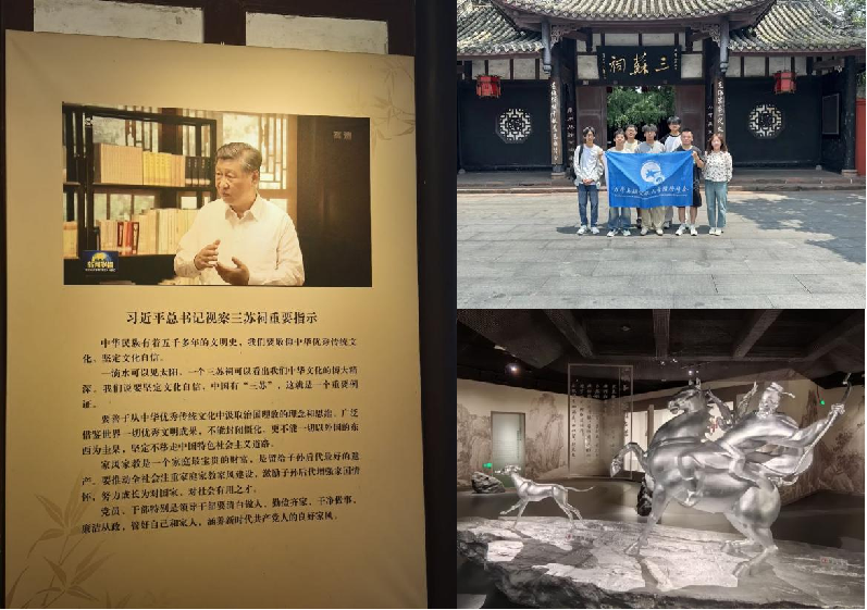 实践队伍本次来到了眉山市的三苏祠。三苏祠是北宋著名文学家苏洵、苏轼、苏辙三父子的故居,历经岁月洗礼,如今已成为国家二级博物馆、国家4A级旅游景区以及全国重点文物保护单位。2022年6月8日,习近平总书记在考察三苏祠时指出:“一滴水可以见太阳,一个三苏祠可以看出我们中华文化的博大精深。我们说要坚定文化自信,中国有‘三苏’,这就是一个重要例证。”团队成员们牢记习近平总书记的教诲,深入调研三苏祠在文化传承与旅游发展方面的成功经验。