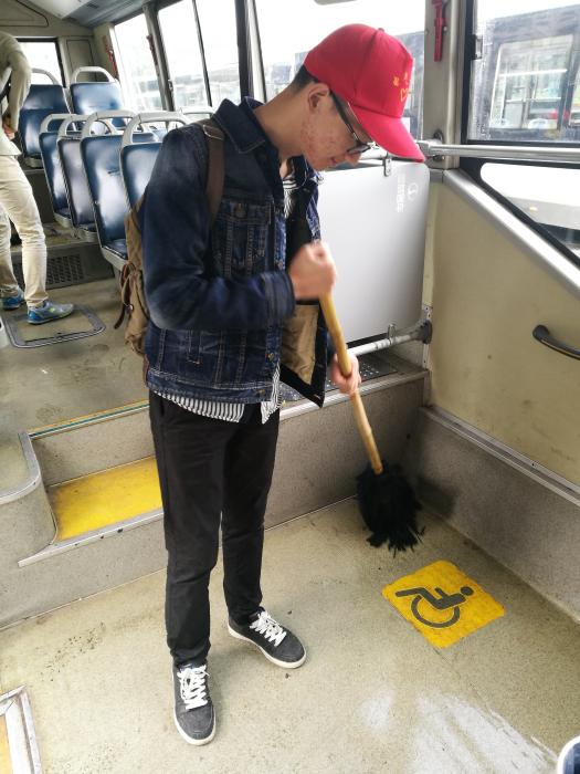 不止如此,志愿者还走进公交车内,检查车内安全措施、安全锤、消防设备等是否完好。并和保洁人员一同整理车厢卫生。