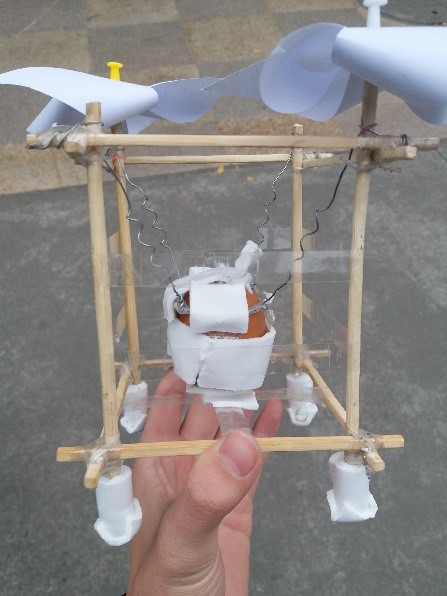 63组,成员为组长金钊和组员钱阳,周晓芳。作品分为顶部风车部分,底部缓冲装置,消能结构,软接触设计和防触地设置,该装置设计合理,整体轻盈,约合80g,而这鸡蛋就占了50g,足以说明该装置之巧妙。而结果也在意料之中,完美着地而且未有太大碰撞,鸡蛋也是完好无损。
