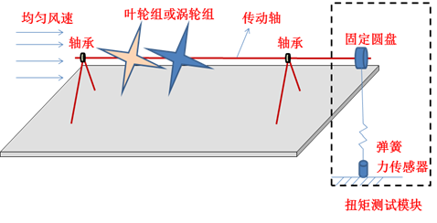 本次比赛,不对叶片的形式做具体要求,可以是涡轮叶片或者叶轮叶片。模型的设计形式可参考图3,转轴上叶轮组或涡轮组的个数不限制,每组叶片的个数也不具体要求。在风力作用下,叶片对传动轴产生扭矩作用,扭矩大小可由扭矩测试模块测得。不要求设计结构具有发电功能,主要针对叶片和转轴相关设计做重点考核。