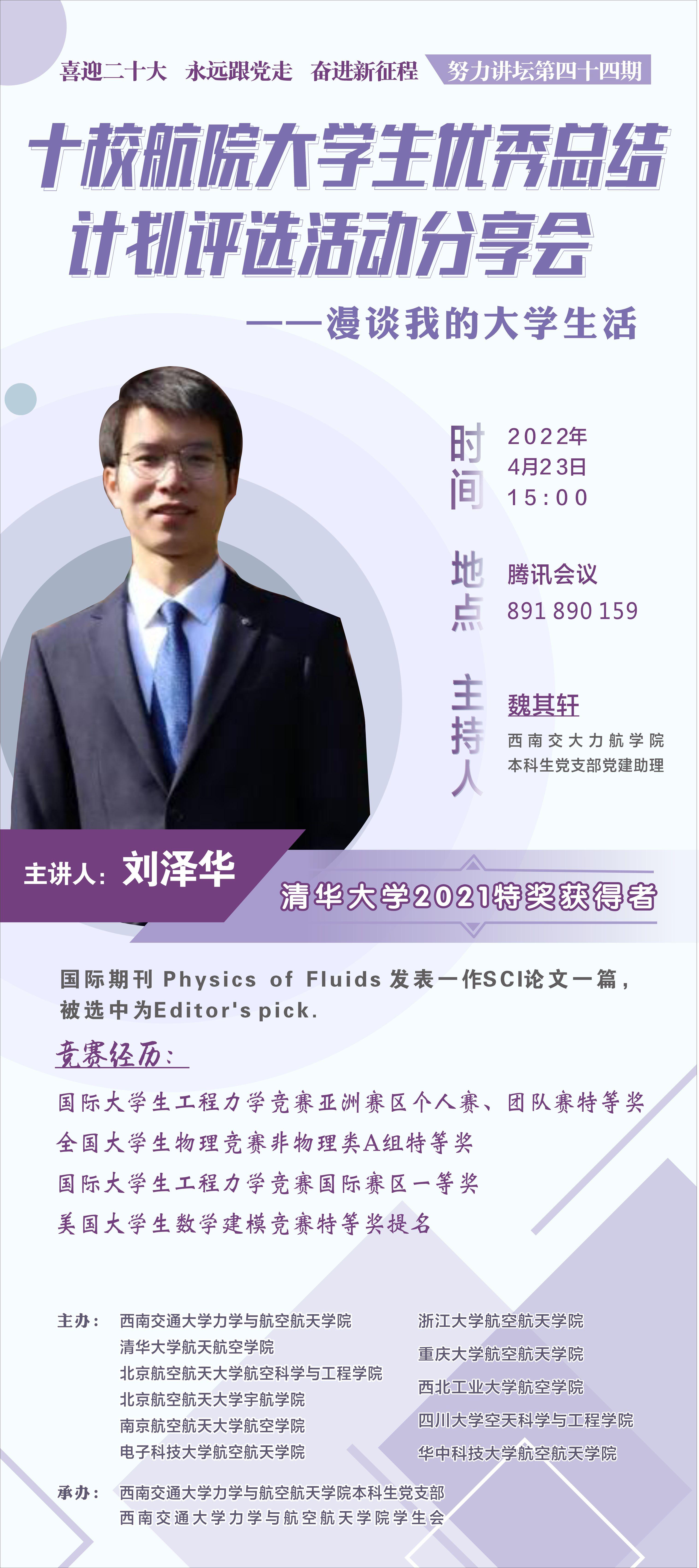 2022年4月23日下午,十校航院大学生优秀总结计划评选活动分享会暨“努力讲坛”第四十四期“漫谈我的大学生活”顺利开展,本次活动由西南交大、清华、北航、南航、浙大、西工大、华科、川大、重大、电子科大十校航院主办,西南交通大学力学与航空航天学院本科生党支部、学生会承办。本次活动以线上分享的方式进行,主讲嘉宾为清华大学航天航空学院2018级本科生、清华大学2021特奖获得者刘泽华,本次活动由beat365正版唯一官网必一本科生党支部党建助理魏其轩同志主持,力航学院党委副书记孔祥彬、本科生党支部书记王彪老师等十校航院师生共同参加了本次活动。