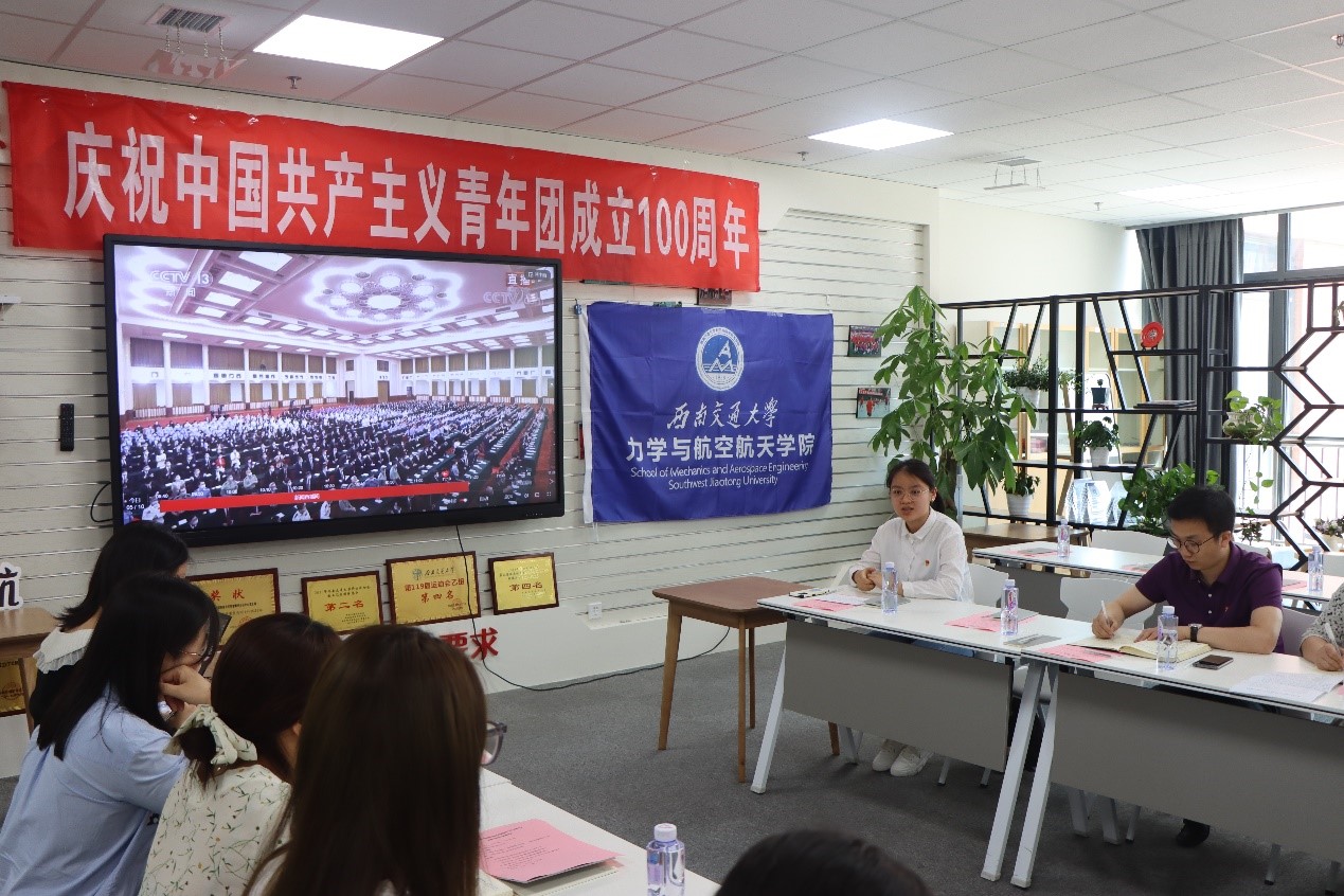 师生代表们认真学习习近平总书记在庆祝中国共产主义青年团成立100周年大会上发表的重要讲话。学校五四青年奖章获得者苗鸿臣、全国铁路向上向善好青年获得者赵吉中、学院示范团支部获得者代表肖瑶纷纷发言。大家表示,“少年强则国强,少年智则国智,少年进步则国进步”。惟奋斗者进,惟奋斗者强,惟奋斗者胜。正如习近平总书记讲话中提到,青年人的命运始终同国家的命运紧密相连,青春的力量是推动祖国屹立于世界民族之林的力量源泉。作为新时代的青年,不忘初心,坚定信念,要明确未来自身的奋斗方向,提高自身能力,练就一身过硬本领,把国家发展和自身命运紧密结合,为祖国建设添砖加瓦。