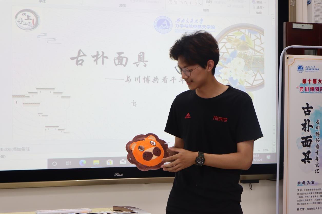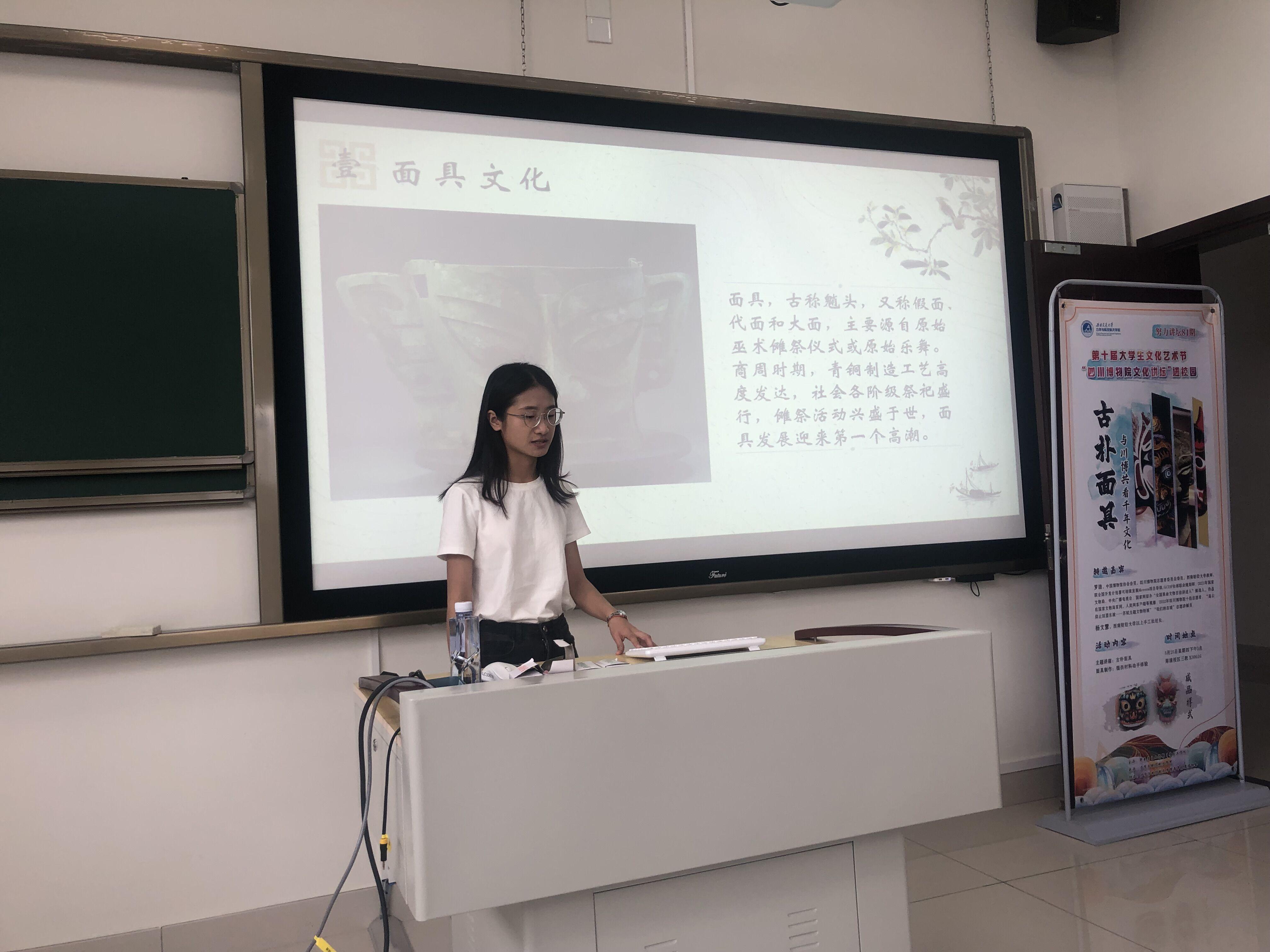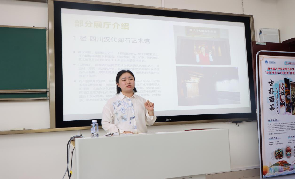 中国博物馆协会会员、四川博物院志愿者委员会委员罗洁进行主题讲座。罗洁介绍川博的人气文物,新石器时期人面形玉佩、水陆共战纹铜壶、唐青釉武士瓷俑引发同学们强烈的逛展兴趣。同时罗洁深入浅出地向同学们讲解了古代面具在四川博物院里的保存、发展与传承的具体过程,用文物案例具体细致地让同学们了解和感受面具背后所蕴含的历史文化以及当今科技发展对文物的保护所作出的贡献。