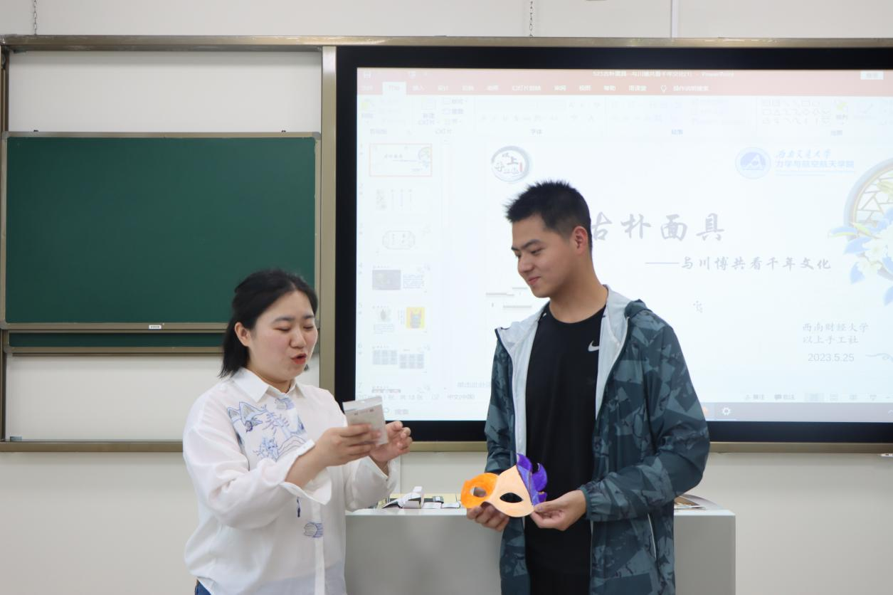 西南财经大学“以上手工社”社长杨文慧向大家介绍了古朴面具的文化背景。商周时期面具迎来第一个高潮,发展到宋元时代宫廷傩戏和民间傩戏流行,面具制作迎来第三个高峰。杨文慧为大家展示面具制作的过程,准备面具和超轻黏土,黏土造型,糊纸塑型,最后上色,一个古朴面具便呈现在大家面前。