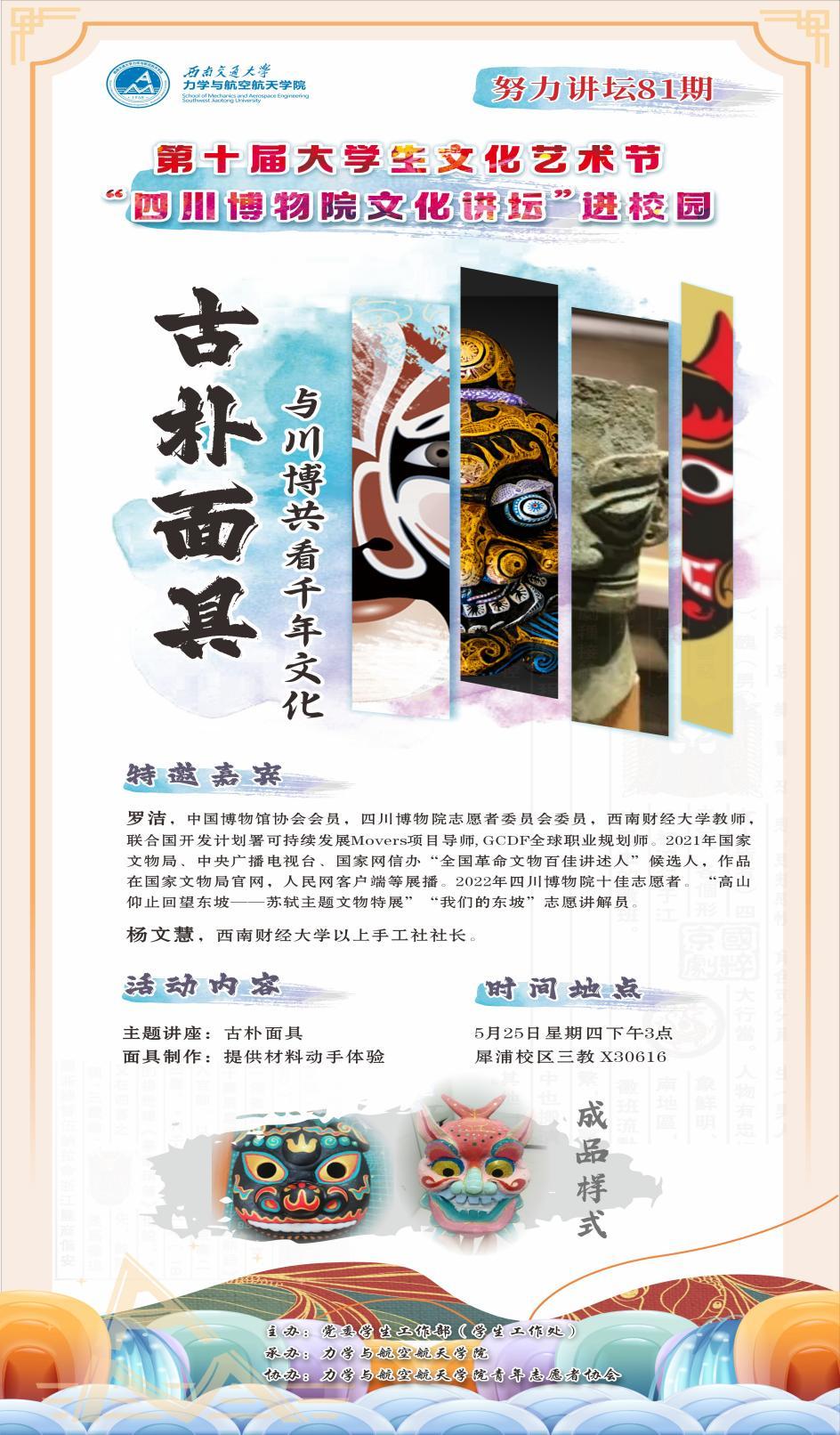5月25日下午3点,beat365正版唯一官网必一在犀浦三教X30616顺利开展主题为“古朴面具:与川博共看千年文化”的第十届大学生文化艺术节活动,来自全校120余名师生在“525·我爱我”这特殊的一天从“心”开始,绘出色彩,共享川博文化魅力。