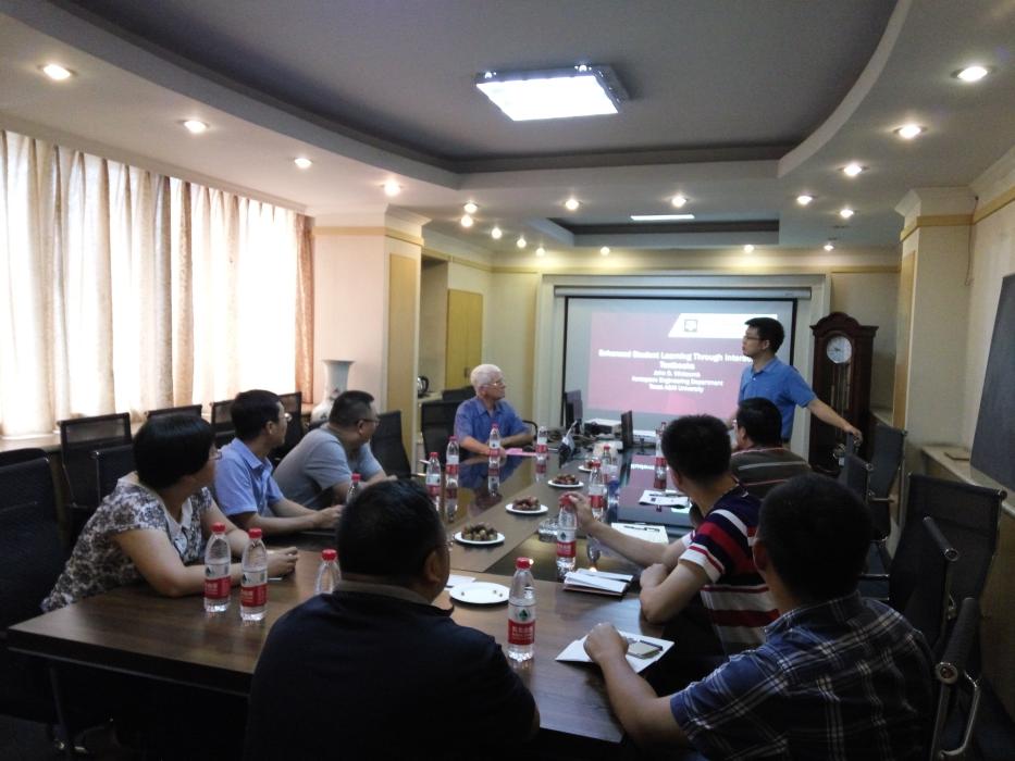 2017年8月18日下午3:00,在九里校区行政楼二楼222会议室,来自美国Texas A&M University航空系的Whitcomb教授与我院教师济济一堂,展开了交互式教材建设方面的研讨。本次研讨会由蒋晗副院长主持,沈火明,李映辉,阚前华,张娟,李鹏,刘金玲,刘宇杰和袁江宏老师参加了本次研讨会。首先,Whitcomb教授做了题为“Enhanced Student Learning Through Interactive Textbooks”的报告,通过四个实例演示了如何通过Maple编程实现材料力学经典案例的交互式操作过程;随后,阚前华助理简要介绍了学院概况、教学成果和教材建设情况,李鹏副教授介绍了“飞行器设计与工程”新专业的课程设置情况。与会者对该形式的交互式教材建设形式、成效和可操作性进行了深入讨论,最后,由蒋晗教授对本次研讨会进行了总结,并对Whitcomb教授的无私分享表示感谢,直至下午17:30左右,研讨会圆满结束。