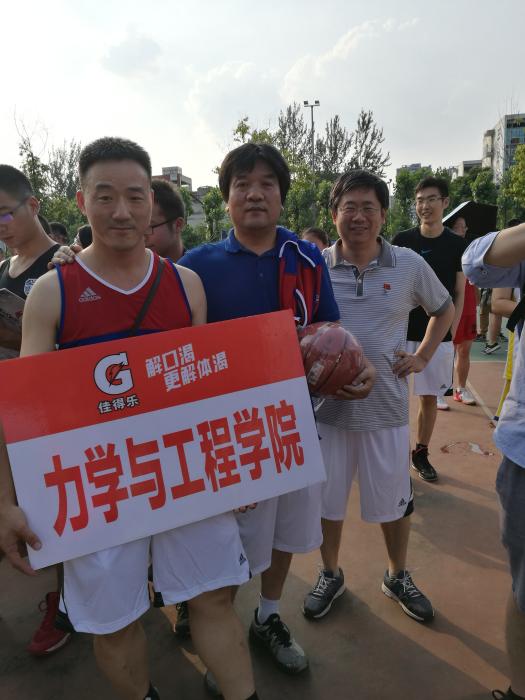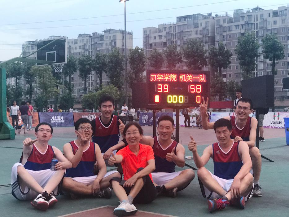 2017年6月6日在西南交大犀浦校区篮球场停摆十几年的教职工篮球赛终于拉开战幕。力学与工程学院在康国政院长和刘菲主席的组织和参与下组队参加了本赛事。我们被分在了C组,有实力强大的机关一队和后勤集团队。我们的队伍虽然年龄偏大,场上主力队员三位四十岁以上,但他们的球技不输给年轻人。康国政院长年轻时也是位篮球爱好者,近年来也长期坚持组织自己科研团队的老师和研究生进行篮球友谊赛,所以球感较好,并场场打满全场,可谓是绝对的主力。首场比赛对阵物理学院,40.5:20.5轻松拿下比赛。首场比赛的胜利给了我们些许的信心。第二场小组赛对阵实力强大的后勤集团,在后勤的严加防守下,我们打不出默契的配合,后勤队配合默契,很快控制了局面,最后我们不敌对手以12.5:30败北,比分意外悬殊,信心受挫。第三场对本组最强的机关一队,由于主力康院长有会不能参加,实力削减,替补上场,部门工会委员范晨光老师和新进老师胥奇老师有机会上场,他们表现神勇,超水平发挥,配合场上主力谷丽瑶、朱志武、储节磊很好地完成了比赛。小伙子们完全放开了,打得酣畅淋漓,最后居然拿下39分,虽然比赛输了,但虽败尤荣。周末休息后,迎来了最后一场小组赛,6月12日周一与电气学院争小组第三。刚开始我们打得比较紧,四比九落后。经过调整后,追上比分,上半场结束时比分持平。下半场比赛更加紧张,两队比分一直咬得很紧,交替上升,最后我们以25.5:23小胜,拿到了预期的小组第三。