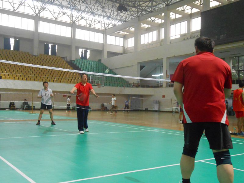 比赛采用本次校团体赛的比赛规则,只进行男双女双与混双三个双打项目的比赛。我们分别把队伍分成了教工一队和教工二队以及研究生一队和二队。首先进行了水平相对高的一队的比赛。女双由长期坚持打球的葛玉梅教授和焦雨老师配合对阵平时没什么配合的两位女学生,虽然两位老师的年龄是学生的一倍还不止,但她们娴熟的球技使得她们以绝对优势2:0拿下了教工一队的开门红。男双的比赛水平相当,比分交替上升,最后教工一队以微弱优势一2:1赢得了胜利。混双由部门工会主席刘菲教授和国家级教学名师龚晖配合,虽然年轻的研一的男学生个人球技水平高出大家一截,无奈又输在配合上,0:2不敌教工组合。接下来还进行了二队的比赛。二队的老师平时球打得不多,特别是副书记高磊老师平时多踢足球,头一次站到羽毛球的赛场上。他与范晨光老师的双打在第三局以14:15的一分之差输给了研究生二队的男双。同时研究生二队还赢得了混双的胜利。教工二队仅拿下了女双比赛的胜利。赛后大家意犹未尽还各自组队进行了切磋,直到场地截止的三点才结束。