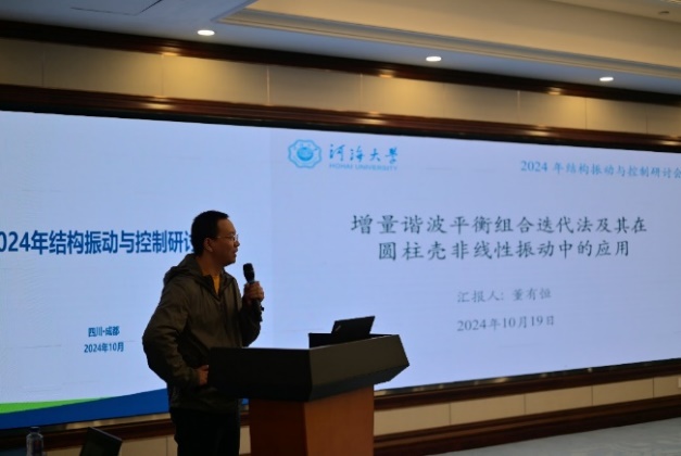 本次会议一共安排了7个大会特邀报告。10月19日上午,河海大学的董有恒副教授作了题为“增量谐波平衡组合迭代法及其在圆柱壳非线性振动中的应用”的首场学术报告,展示了增量谐波平衡组合迭代法求解复杂强非线性系统的优势和计算效率。随后,中国工程物理研究院的姬永强高级工程师作了题为“高速非稳定弹体次口径试验技术研究”的学术报告,讲述了高速非稳定弹体的最新试验研究成果,通过视频的方式直观地展示了弹体的运行稳定性和冲击动力特性。航天材料及工艺研究所的冷霜高级工程师作了题为“航天先进结构复合材料制造技术及能力介绍”的学术报告,讲述了复合材料应用在航天结构中的最新科研成果。西南石油大学的赵翔副教授作了题为“超细长结构复杂耦合动力学行为研究进展”的学术报告,分析了超细长结构的几何特点与力学特性,研究了该类结构在复杂环境下的耦合动力学行为。