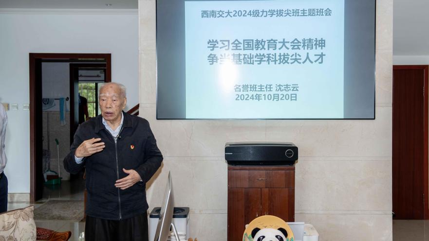 10月20日上午10点,中国科学院院士、中国工程院院士、力学拔尖班名誉班主任沈志云教授在峨眉校区带领力航师生开展学习全国教育大会精神活动。力航学院党委副书记孔祥彬、2024级拔尖班班导师张波等老师以及2024级力学拔尖班同学参加学习。学习会由孔祥彬主持。