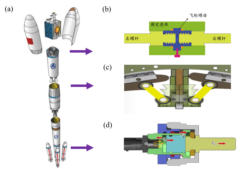 图2 (a) 航天分离过程中的 (b) 飞轮螺杆分离装置 (c) 螺杆传动分离装置和 (d) 分瓣螺母分离装置[2]