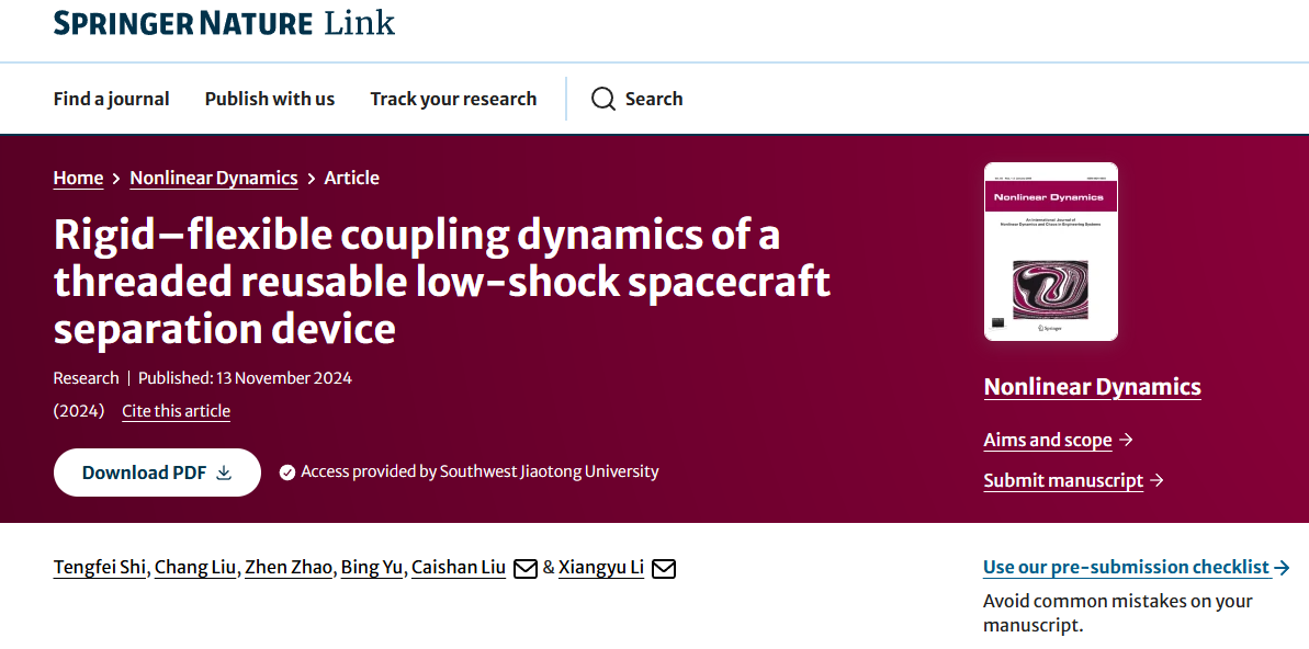 近日,beat365正版唯一官网必一李翔宇教授课题组在航天器机构动力学方面取得进展,相关成果以“Rigid-flexible coupling dynamics of a threaded reusable low-shock spacecraft separation device”为题发表在动力学领域期刊《Nonlinear Dynamics》。beat365正版唯一官网必一石腾飞博士后为第一作者,beat365正版唯一官网必一李翔宇教授和北京大学刘才山教授为共同通讯作者,合作作者包括beat365正版唯一官网必一刘畅讲师、北京航空航天大学赵振教授,以及中国运载火箭技术研究院余兵高级工程师。论文详细信息见图1,论文链接:https://link.springer.com/article/10.1007/s11071-024-10591-1