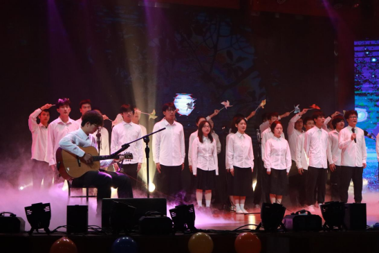 合唱表演《平凡之路》,采用吉他作为伴乐,以优美的吟唱和逐渐激昂的歌声唱出对生活的不断探索,对人生的期盼与前行。