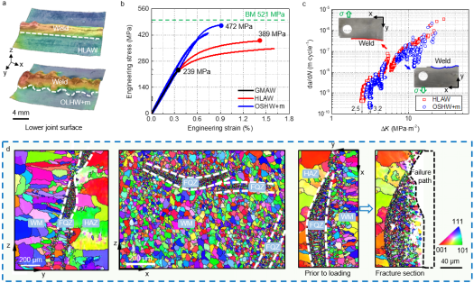 研究人员受到力学三明治结构的启发,提出焊缝有规律弯曲分布的成形思想,同时引入脉冲电磁场消除接头中微裂纹和气孔,来探索接头拉伸强度与抗疲劳性能大幅提升的可能。研究表明,传统接头熔合线附近的细晶带呈现连续且线性走向特征,而经过“激光扰动+磁场脉冲”成形后,细晶带在焊缝熔合线处将呈现出“S”形、断续分布特征,且部分细晶带由熔合线转移至焊缝中心,从而使得细小等轴非枝晶与粗大等轴枝晶实现了交替分布。一方面,“激光扰动+磁场脉冲”联合制造策略有助于改善合金元素分布,减弱强化元素晶界偏析程度,与传统焊接工艺相比,晶粒内部强化相数量增加,进而提升了接头的硬度和强度,使其达到了固相焊接水平。另一方面,“S”走向、断续分布的细晶带显著增加了裂纹扩展阻力,从而大幅提升了接头的“韧性”。此处所述的“韧性”主要指固体力学的损伤容限能力,而非简单地材料学中的断裂韧性。