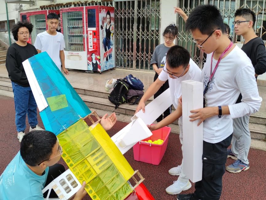 比赛过程中,西南交大航模队队员团结一致,顽强拼搏。从暑假备赛开始,西南交大航模队克服了种种困难,在学校、学院和专业指导老师的支持帮助下积极推进设计制作工作,认真完成了气动分析、建模、切割、测试等各环节,制作了参赛用机,并且在投放系统、制作工艺、动力系统等各个方面不断地迭代优化,提升改进。最终,参赛模型采用上单翼,双发,常规尾翼布局,长1.5m,翼展1.8米,设计最大载荷为44个网球。