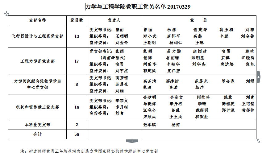 2017年3月份力学学院教学系调整为“工程力学系”和“飞行器设计与工程系”后,教职工党支部改选工作也已经完成。现将学院教职工党员名单进行公布,请各党支部按照新的名单开展本支部工作。具体名单如下: