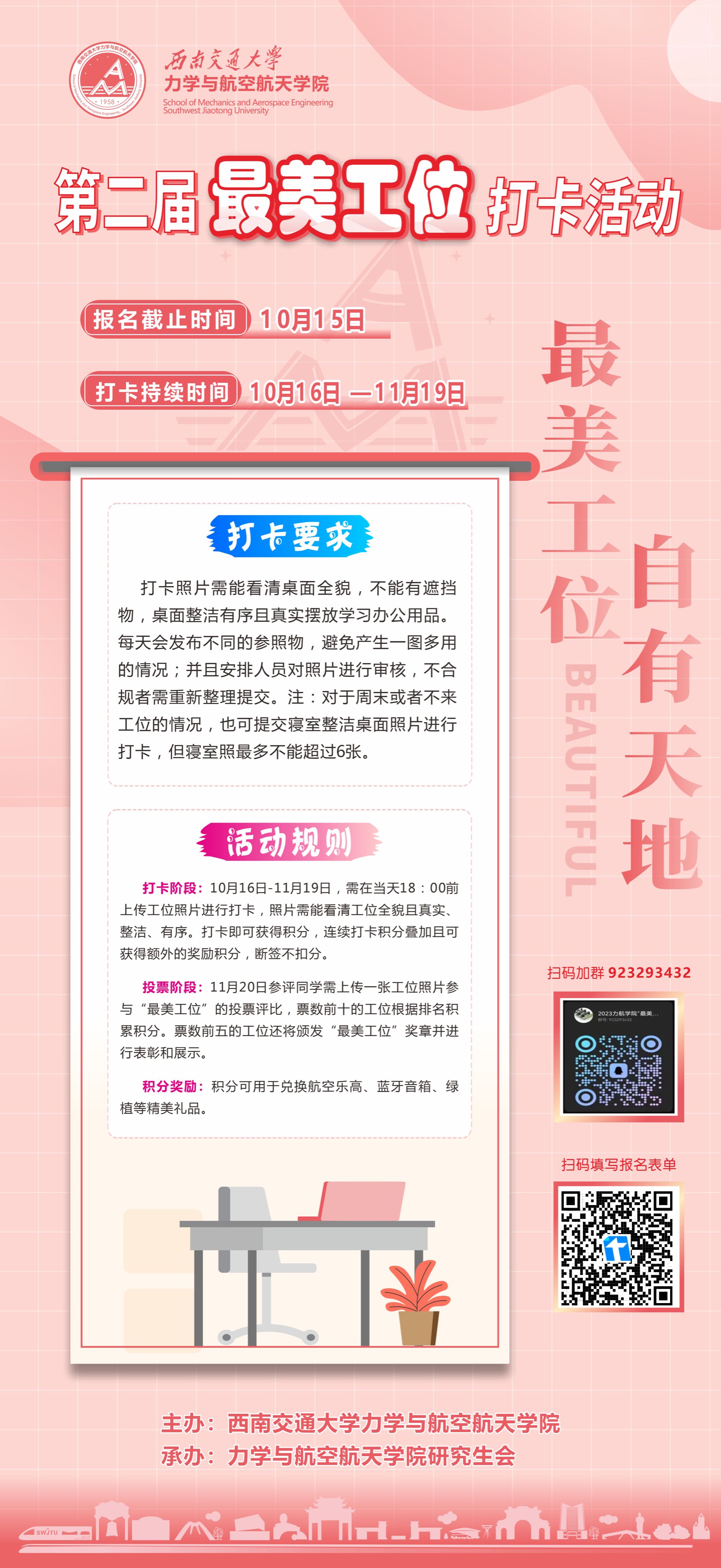 1.报名阶段:10月12-15日,请有意参加的同学填写在线表单:【腾讯文档】最美工位 自有天地 https://docs.qq.com/form/page/DTk5Gc1lNQXNvamtR ;同时方便后续活动事宜通知,添加QQ群:923293432