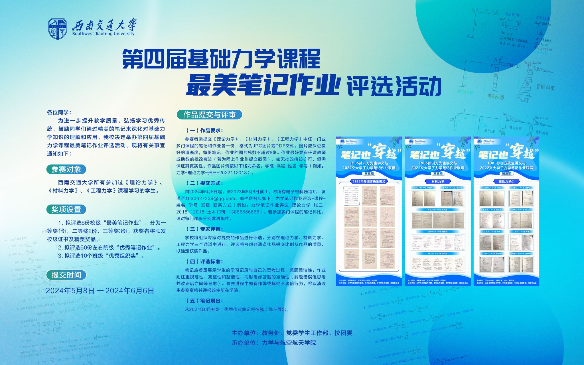 (二)提交方式:自2024年5月8日起,至2023年6月6日截止。将所有电子材料压缩后,发送至1030627339@qq.com。邮件命名应如下:力学笔记作业评选-课程-姓名-学号-班级-联系方式(例如:力学笔记作业评选-理论力学-张三-2018112018-土木10班-13866666666)。若参加多门课程的笔记评比,请对每门课程分别发送邮件。