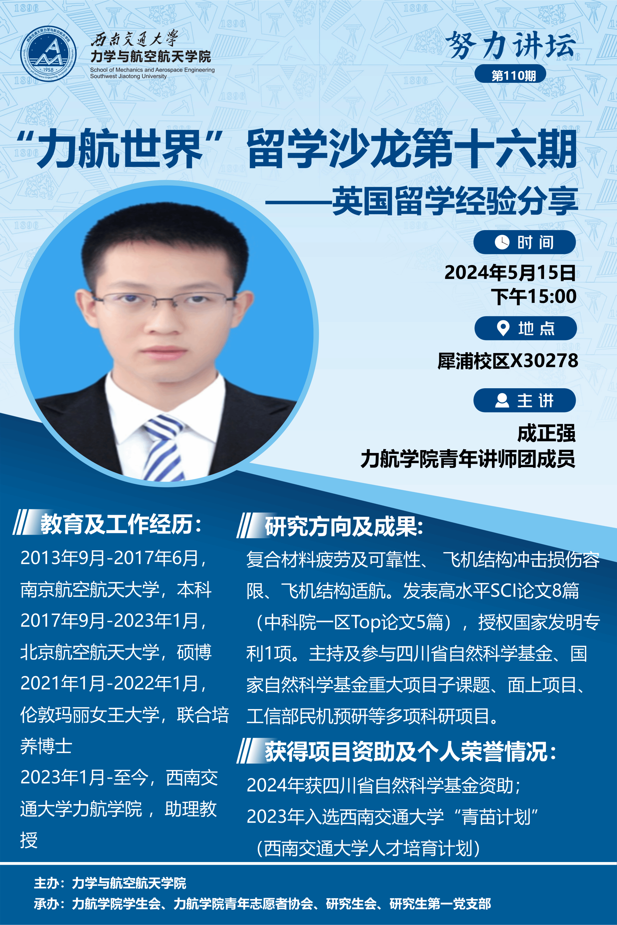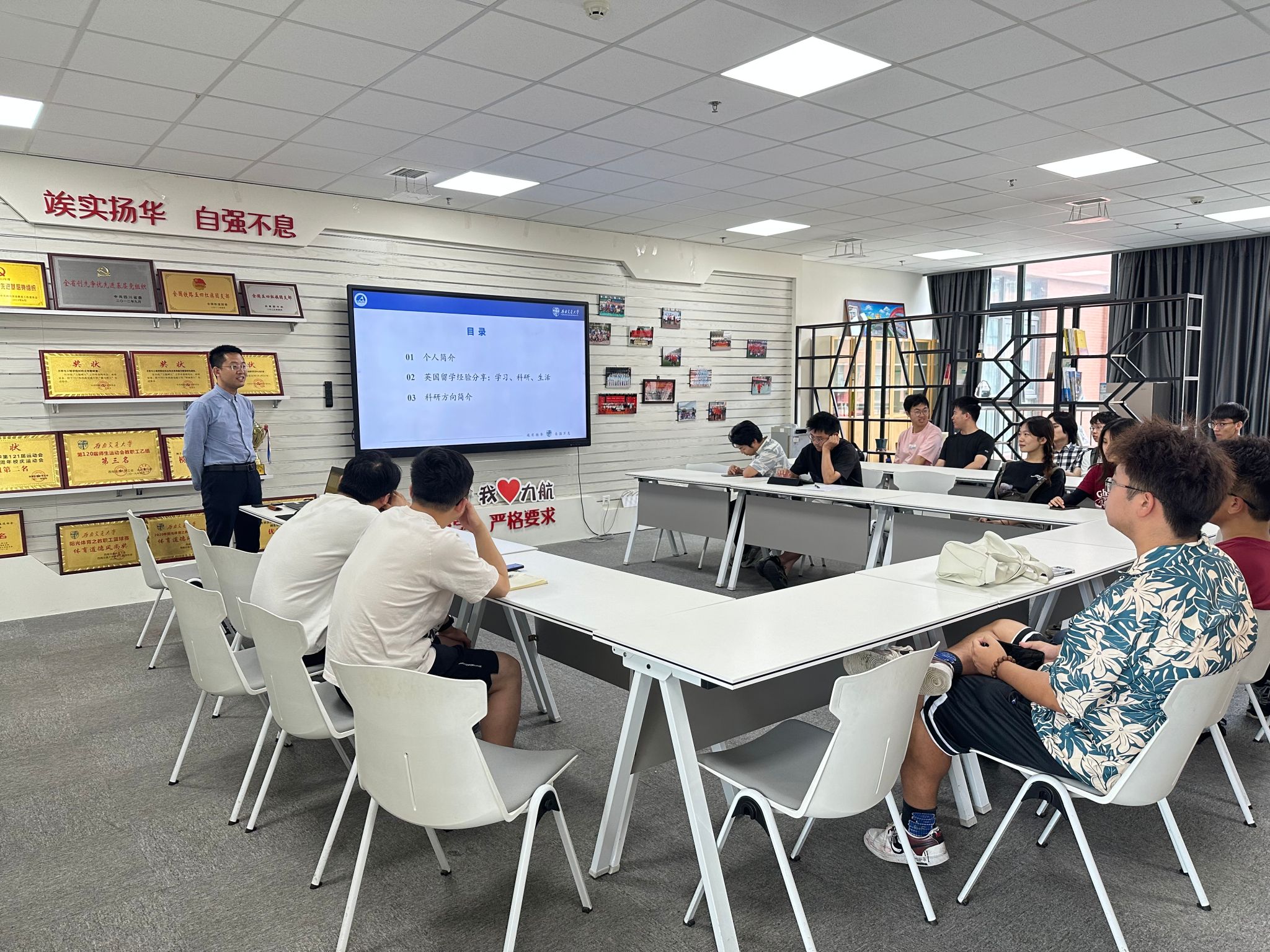 成正强老师在北京航空航天大学攻读博士学位期间曾前往伦敦玛丽女王大学进行博士联合培养,于2023年来我院任教。本次活动,成正强老师以“英国留学经验分享”为题,从个人简介、英国留学经验分享、科研方向简介等几个方面进行了分享。