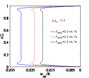 研究结果显示,当少量的石墨烯片掺杂到复合材料中,壳体结构刚度能得到显著的提高。随着石墨烯片含量的增加,圆柱壳前屈曲局部变形逐渐减小,壳体临界屈曲载荷逐渐增加。对称的石墨烯片分布方式具有较好的结构刚度增强效果。当石墨烯片的长宽比确定时,随着长厚比增加,壳体临界屈曲载荷增加;当石墨烯片的长厚比确定时,随着长宽比增加,壳体临界屈曲载荷降低,但是影响较小。圆柱壳体在前屈曲局部下,中间部分的前屈曲变形基本为定值,而端部区域的前屈曲变形呈振动波形,最大变形峰值一般发生在离端部距离为0.05L的位置处,并且前屈曲变形从最大变形峰值处快速减小到边界处为零。