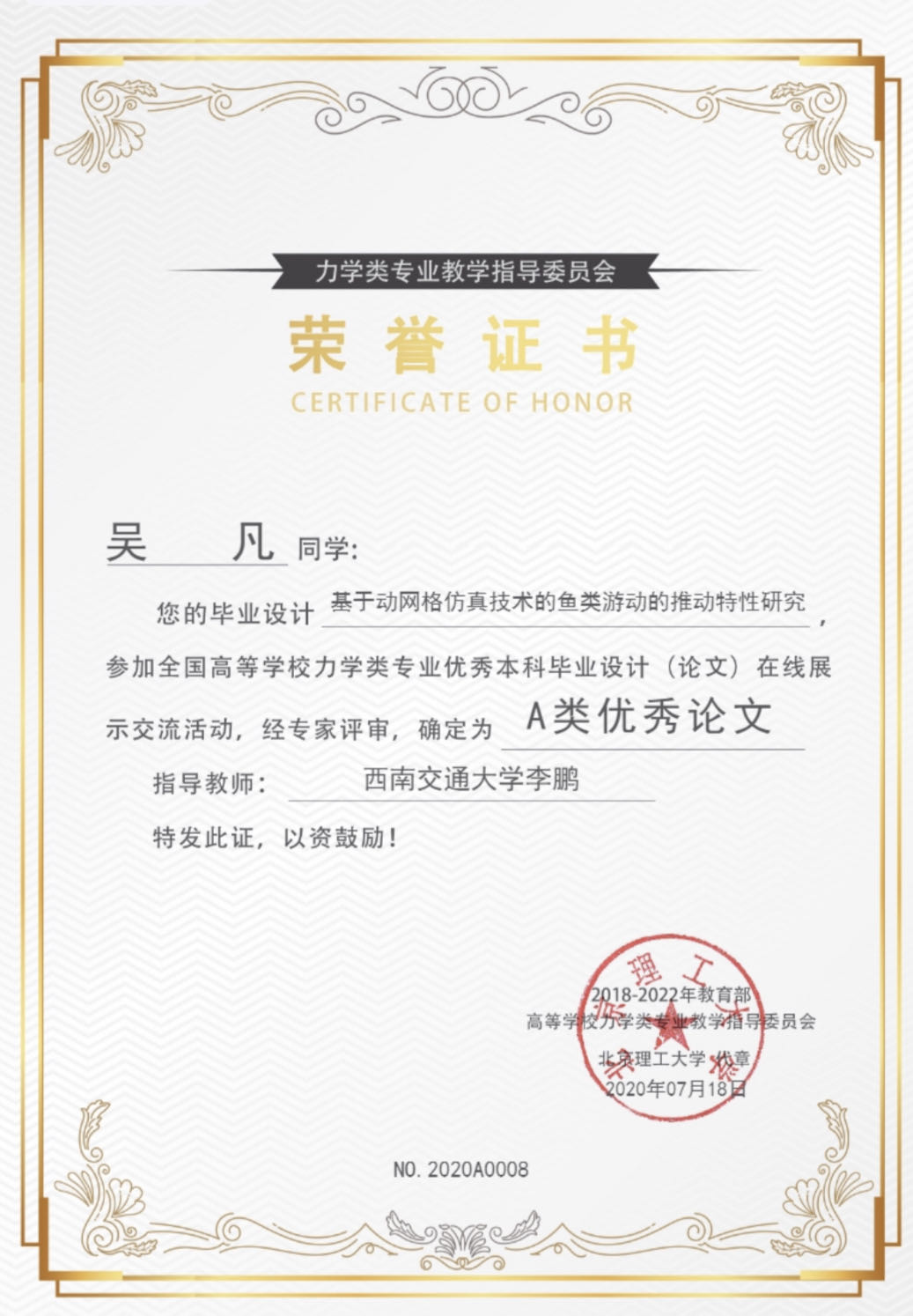 近日,教育部高等学校力学类专业教学指导委员会公布了“首届全国高等学校力学类专业优秀本科毕业设计(论文)在线展示交流活动”获奖论文,我院参加评选的两位同学均获奖。其中,吴凡同学的本科毕业论文“基于动网格仿真技术的鱼类游动的推动特性研究”荣获A类优秀论文,熊君媛同学的本科毕业论文“形状记忆合金力学行为的相场模拟”荣获B类优秀论文。他们的指导老师分别为李鹏副教授和康国政教授。