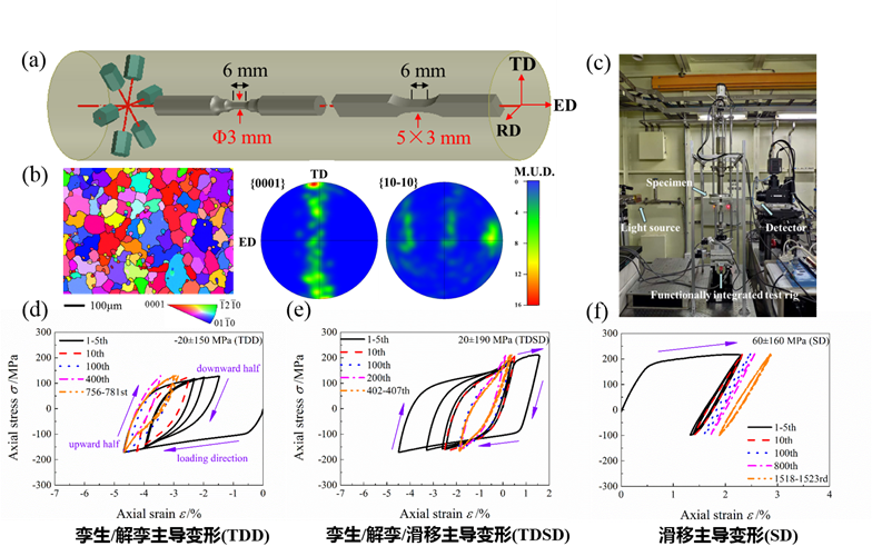 图 1:(a)样品尺寸,取样方式及织构示意图;(b)初始挤压态样品EBSD结果;(c)上海同步辐射光源实验现场;(d-f)三种加载工况下的应力-应变曲线。