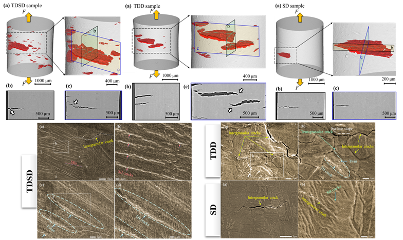 实验结果表明,三种加载模式下样品的损伤形式迥异:TDSD样品中可观测到大量裂纹萌生,TDD样品中裂纹数目减少,而SD样品中仅出现单个裂纹;TDSD样品中,裂纹间出现剪切合并的形式,TDD样品中两条表面裂纹间出现剪切合并的趋势,而SD样品中裂纹基本平行于横截面扩展;SD样品中有沿晶裂纹和滑移带裂纹产生,而在TDSD和TDD样品中还观测到了孪晶界裂纹。