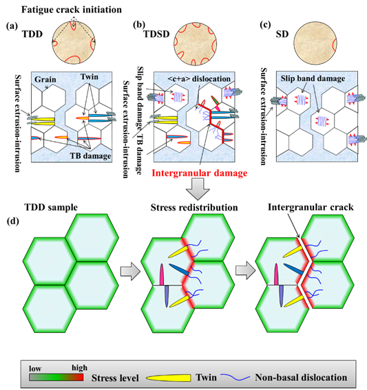 基于实验结果,研究人员提出多种变形机制参与时镁合金的损伤机理:孪生相较于位错滑移而言更易发生,因此相较于SD样品,TDD样品中大量孪晶的产生更加有助于裂纹的萌生;对TDSD样品而言,晶粒中<c+a>位错的产生可使晶内平均应力维持在较高水平,而相邻晶粒中孪晶的产生却释放了晶内应力,因此晶间应力发生重分配。产生孪晶的晶粒之间的晶间应力将重分配到无孪晶晶粒与含孪晶晶粒间,导致除了孪晶界损伤和滑移带损伤之外,产生额外的沿晶损伤,这解释了TDSD样品中裂纹数目最多的原因。