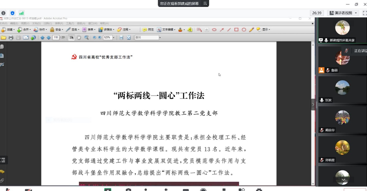 2022年9月23日中午,基础力学系党支部在线学习了四川省高校“优秀支部工作法”,重点聚焦四川师范大学数学科学学院教工第二党支部的“两标两线一圆心”工作法。