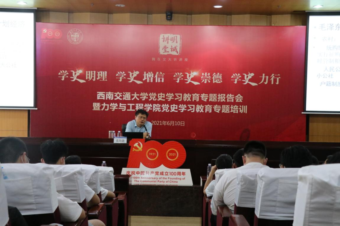 6月10日下午,beat365正版唯一官网必一“明诚讲堂”党史学习教育专题报告会暨力学与工程学院党史学习教育专题培训在犀浦校区图书馆第二报告厅举行。中共四川省委党校教授张传能作了专题报告。本次报告会由党委宣传部和力学与工程学院党委联合举办,力学与工程学院党委书记栗民、院长康国政、学院其他领导班子成员、党委委员、各党支部书记及委员、师生近300人参加了此次报告会,学院党委书记栗民主持报告会。
