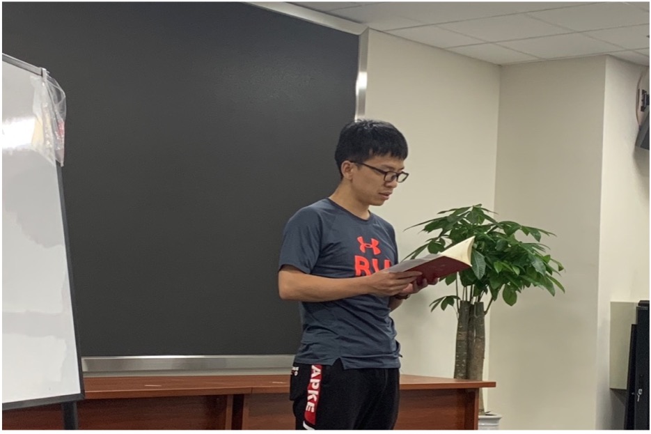 研究生第一党支部丁立同学分享了《毛泽东选集》中的文章,重点诵读了《丢掉幻想,准备斗争》一文,赞叹了革命先辈不怕苦不怕难,奋勇向前的革命精神。