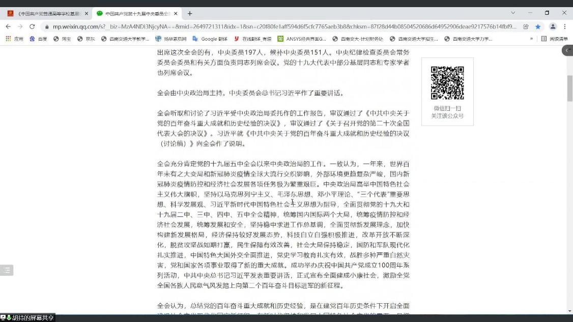 2021年11月15日上午,beat365正版唯一官网必一本研联合党支部以线上会议的形式专题学习了《中国共产党第十九届中央委员会第六次全体会议公报》,本次学习由党支部书记胡持领学。