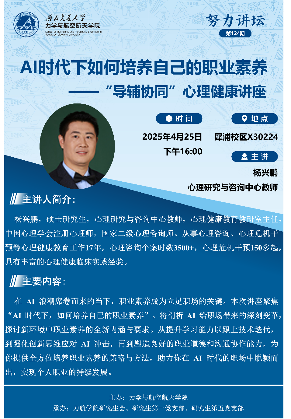 为进一步提升研究生的心理素质,增强心理健康意识,助力学生在学术与生活中的全面发展,2025年4月25日,学院在犀浦校区X30224成功举办了“导辅协同”心理健康讲座。本次讲座特别邀请了学校心理研究与咨询中心的杨兴鹏老师,以“AI时代下如何培养自己的职业素养”为题进行讲解。辅导员安晟斐,学院硕博研究生五十余人参与活动。