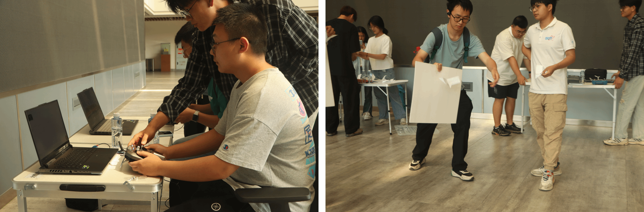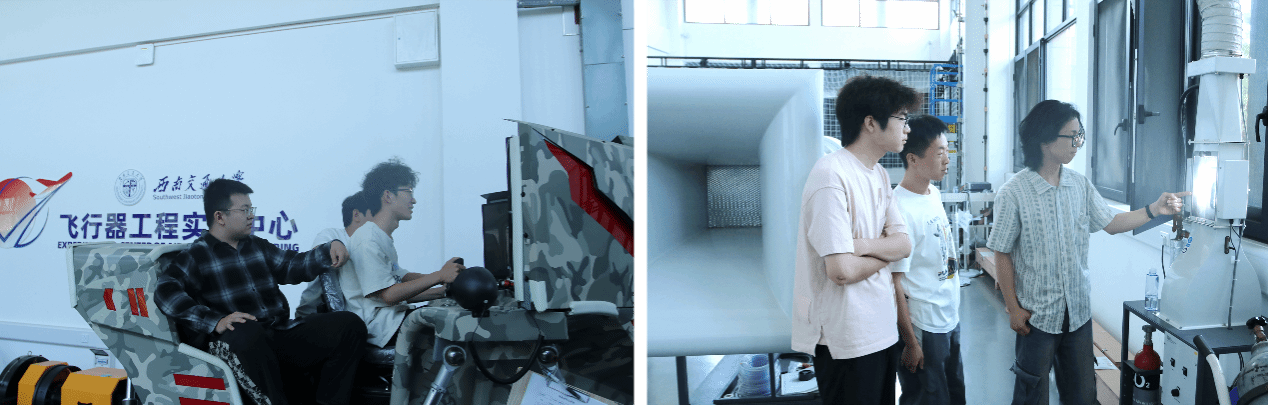 第三个互动区域在力航学院的飞行器工程试验中心。活动邀请了力航文化大使团的同学带领大家了解试验中心,并指导操作六自由度飞行模拟驾驶器,复现飞行状态与环境。同学们沉浸式体验飞行操控,既感受航空科技魅力,又加深了对航空文化与专业科研场景的认知。