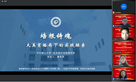 beat365正版唯一官网必一廖凡老师作了题为“‘XIN空间·芯美育’趋美向善、以文化人、以美育人”的报告,介绍了学院将美育融入到德育、智育工作,延伸到宿舍、楼宇空间,打造 “XIN空间·芯美育”品牌系列活动,详细介绍了品牌打造的四条路径:节日植入弘扬传统美、活动植入体现艺术美、文化软植入彰显人文美、专业软植入展示专业美。华东理工大学艺术学院党委副书记王珊进行了点评,她认为beat365正版唯一官网必一生动地展现了理工类高校在加强和推进美育教育中的举措与成效,体现了科学与艺术相结合的理念。科学和艺术可以相辅相成,加强高校美育教育,有利于促进理工类高校的学生在学习生活中强化文化主体意识,推动广大青年学子树立纯真向善审美观,构建美好心灵和健全人格。