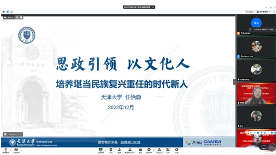 天津大学任怡璇老师作了题为“思政引领、以文化人、努力培养堪当民族复兴重任的时代新人”的报告,介绍了学校围绕“立德树人”的根本任务,秉承“兴学强国”的办学使命,构建的具有学校特色的思想政治工作体系、“三全五育”育人大厦和具有文化积淀的通识教育体系,同时分享了“红叶诗墙”、周末音乐会、讲好天大故事等各类具体特色的实践活动。广西大学电气学院党委副书记雷圆媛做了点评,她对天津大学的思政育人顶层设计做出了高度评价,认为其做到了党建工作、思政教育、通识教育和课外实践的完全一体化,理论体系完整、实践运用丰富,是可示范的高校思政育人、文化育人经典案例。