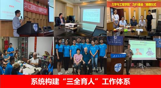 一是全员育人,充分发挥专业教师在思政工作中的积极作用,带领学生拜访沈志云院士、龙驭球院士、黄克智院士等,发挥高庆、高淑英、陈虬等老教授传帮带作用,2019年新当选院士涂善东校友回校讲座,让学生在和大家名师交流中受到教育。