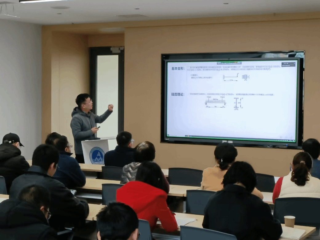 随后,江晓禹教授为大家讲解了提高题的出题思路和解决方法。江教授指出,提高题出题的思路依然是从材料力学基本知识出发,但与基础题不同的是,可适当超出正常的教学大纲要求,须具有选拔作用。因此,本次竞赛的提高题以梁的变形问题为考点,考察学生对大、小变形的判断方法以及大变形近似计算方法。题目从形式上看较为简单,但需要学生掌握扎实的力学基础和数学计算能力。